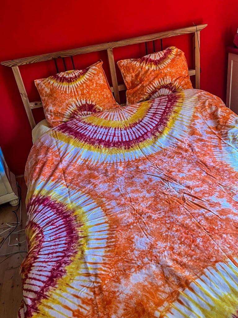 Heute habe ich mein Bett mit diesem Laken und den neuen Kissenbezügen bezogen und ich bin richtig happy. Die Farben und die Muster machen richtig gute Laune!